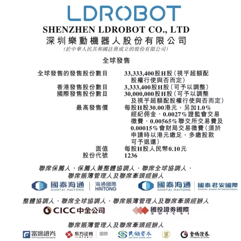 LDROBOT (SHENZHEN LDROBOT CO., LTD., 01236.HK) has commenced its Hong Kong IPO. The subscription period runs from April 30 to May 6, with a planned global offering of 33,333,400 H shares, including a 15% over-allotment option. The offer price ranges between HKD 24.00 and HKD 30.00 per share. Each board lot consists of 200 shares, with an entry fee of approximately HKD 6,060.51. The company is expected to list on the Main Board of the Hong Kong Stock Exchange on May 11. The joint sponsors are Haitong International Capital Limited and Guotai Junan Capital Limited.
