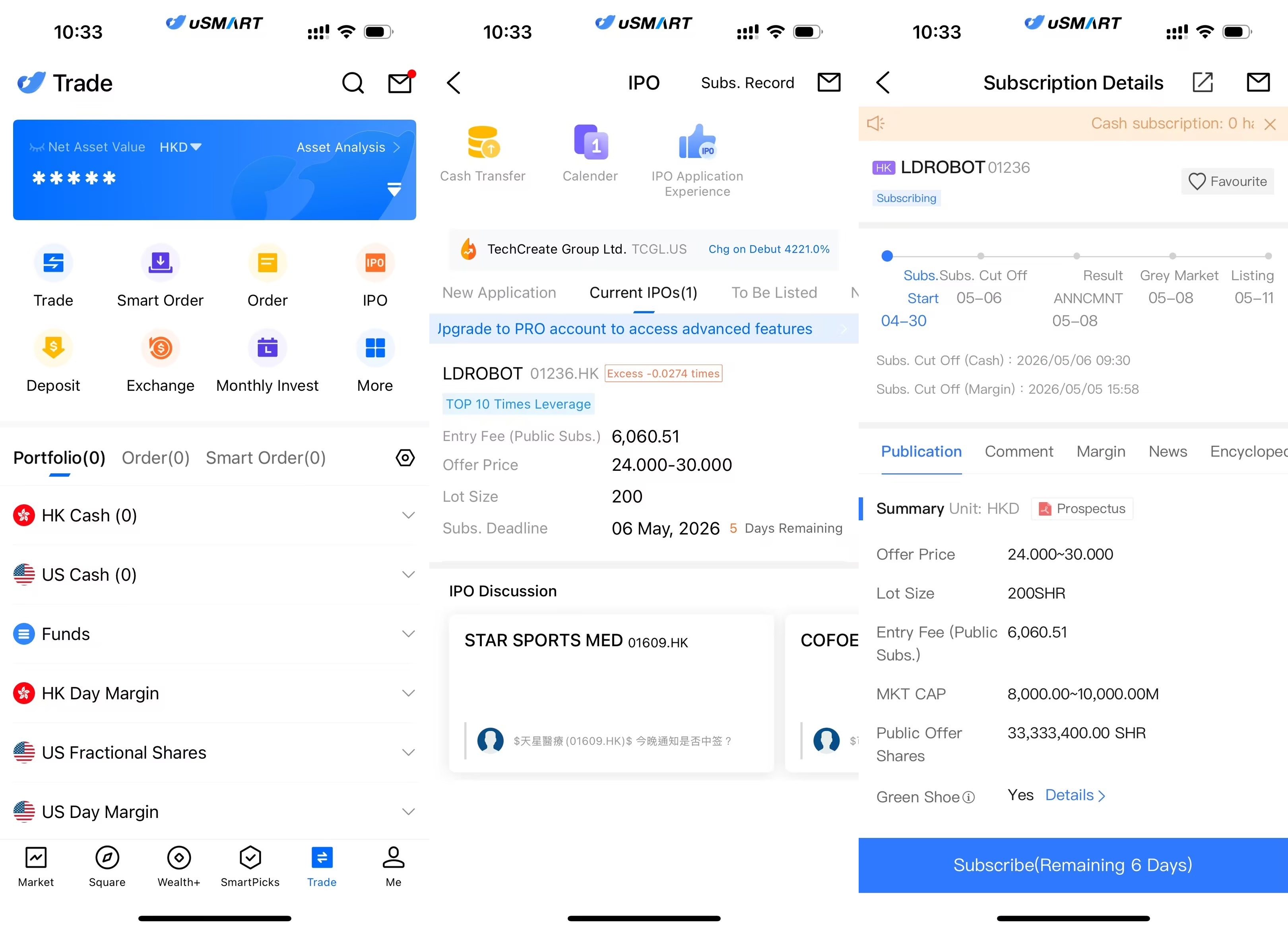 The uSMART HK App features an IPO Centre with exclusive perks, allowing clients to subscribe instantly to public offerings. After logging into the app, tap "Trade" at the bottom-right, go to "IPO Subscription," select LDROBOT, tap "Public Offer," enter your subscription quantity, and submit your order.