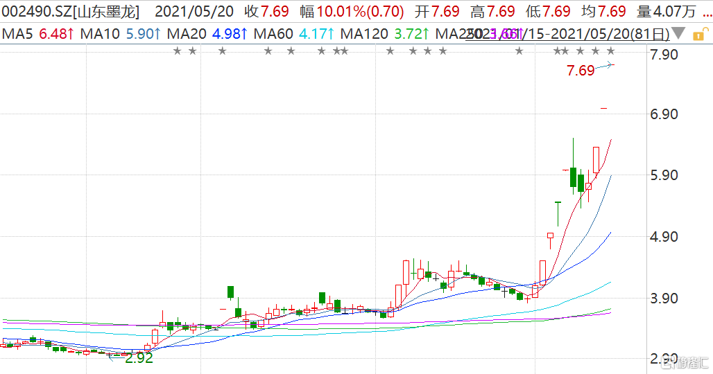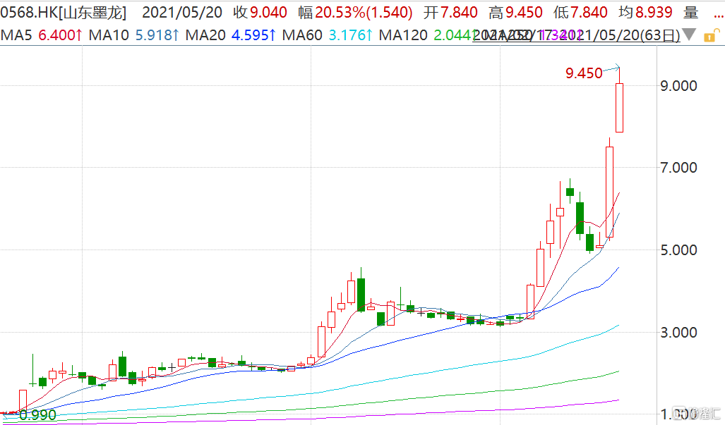 格隆汇5月20日丨山东墨龙A股涨停,为连续第三日涨停,报7.69元,创4年新高,年内累涨134%;H股盘中最高涨26%报9.45港元,股价创14年新高,年内累涨985%;山东墨龙最新市值61亿人民币。股价连续大涨背后,前期大举买入的“鲁丽帮”成最大赢家。5月6日-12日期间,智梦控股及其一致行动人通过集中竞价方式累计增持公司股份3989.2401万股,占公司总股本的5.00%,占股比例升至20%。据悉,在“鲁丽帮”合计所持的15956.97万股中,绝大部分购买的是H股,共15071.48万股,买入的A股仅885.49万股。随后山东墨龙收关注函,要求说明公司及一致行动人是否存在谋求上市公司控制权的意图。