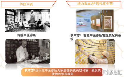 相较于传统中医诊所,公司采用现代化中药管理系统,更加高效,专业。公司拥有现代化中医诊所,旗下农本方诊所配备智能配药管理系统,能够从云端数据存取,配合应用AI技术自主研发诊断程序,可以全方位追溯配药系统,外加具备科学病历管理系统,能够为患者提供更高效可靠,更优质便捷的诊所服务。