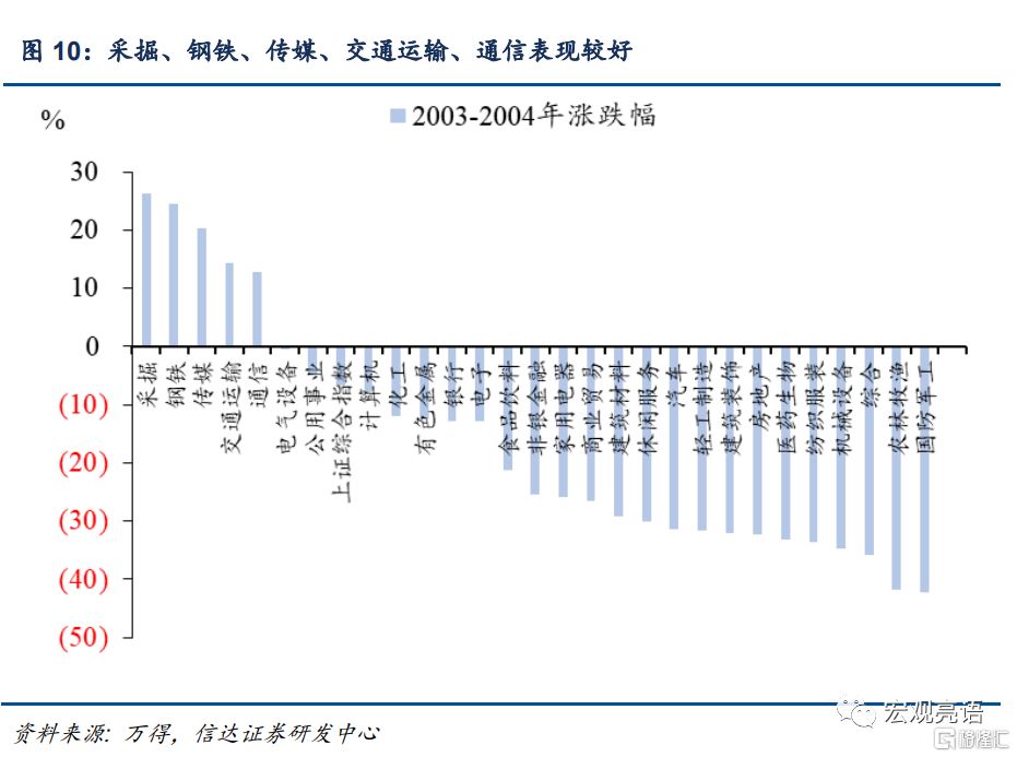 第一轮通胀及应对:2003-2004年。房地产市场化与加入WTO使我国经济内生动力增强,逐渐出现通货膨胀的迹象。央行加强货币政策手段的应用,提准加息,采取差别存款准备金率、公开市场操作、窗口指导等,抑制投资过热,同时加强房地产市场宏观调控。2004年紧缩调控政策取得较好成效,股市整体承压,但与消费机构升级和城镇化进程加快相关联的资本密集型行业,以及3G技术相关的通信行业发展较好。