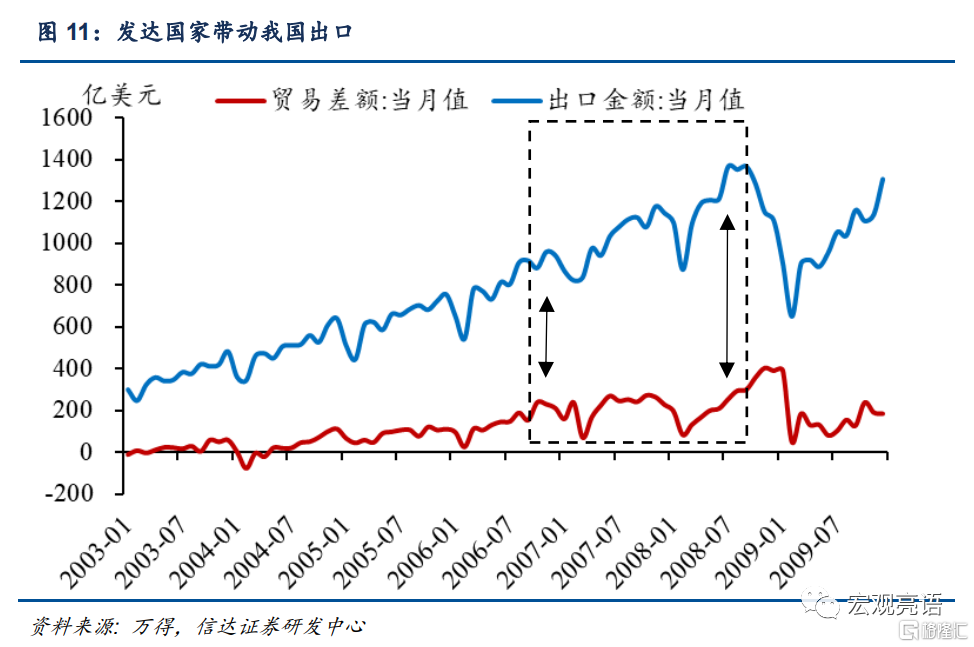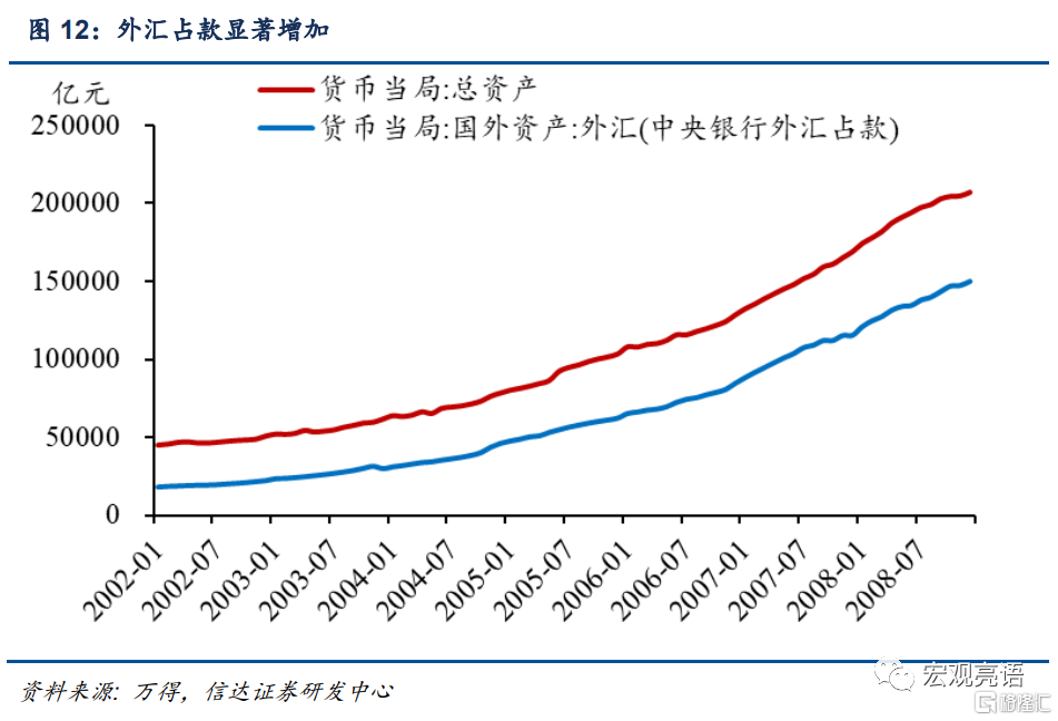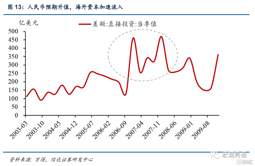 出口拉动增长,经济进入新的扩张期,外资流入及流动性过剩压力显现,通胀压力大。2006年美欧日等发达国家经济表现亮眼,带动我国出口,强劲的外需导致我国出现了较大的贸易顺差(图11),企业盈利因此快速提升,促进企业增加投资。贸易顺差也带动了外汇占款的显著增加(图12),货币投放量被迫增大,流动性过剩压力显现。贸易顺差引起人民币升值预期,海外资本加速流入(图13)。宽松的货币政策加上旺盛的实体需求,经济再次进入扩张期。自2005年起,我国连续14个季度经济增长速度同比超过10%。2006年CPI增长1.5%;2007年CPI增长4.8%,我国经济面临中度通胀。