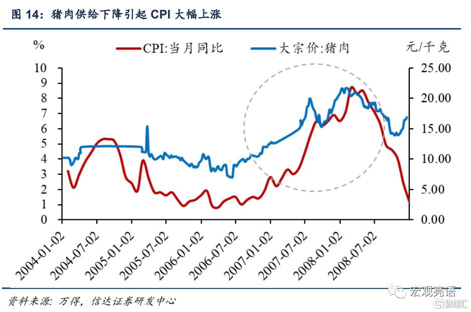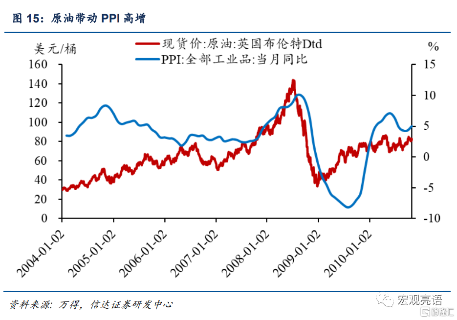 成本上升及猪肉价格上涨分别推动PPI和CPI明显走高,通货膨胀显现。2006年夏季,由于蓝耳病疫情的大规模爆发,猪肉供给受阻,猪肉价格出现了大幅上涨,CPI在2006年3月触底至0.8%后,猪周期启动导致CPI一路快速上涨至2008年2月的8.7%(图14)。2007年9月开始,PPI在原油价格的带动下同比高增(图15)。