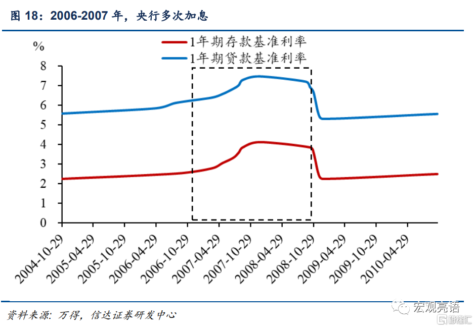 2007年年底召开的中央工作会议上提出了“双防”方针,防止经济增长由偏快转向过热作为宏观调控的首要任务,货币信贷政策频繁收紧调控。第一,频繁上调存款准备金率,冻结流动性。为了对冲流动性过剩,抑制货币、信贷过快增长,2006年4月至2007年12月,央行共13次上调准备金率(图17)。此外,为加强外汇信贷管理,从2006年9月15日起提高外汇存款准备金率1个百分点。第二,多次提高存贷款利率,稳定储蓄,控制信贷增长。2006年4月至2007年12月,央行共8次上调基准利率(图18)。2007年12月也较大幅度地上调了一年以内的定期存款利率,其中,三个月期存款利率上调0.45个百分点,六个月期存款利率上调0.36个百分点。第三,以发行央行票据为主、回购操作为辅,加大公开市场对冲操作力度。针对外汇占款过高的问题,央行发行了大量央票进行对冲,07年末央票未到期量超过40000亿元。第四,多次召开窗口指导会议,首次使用从紧货币政策表述。2006年以来,中国人民银行多次召开“窗口指导”会议,提示商业银行高度重视贷款过快增长可能产生的风险。2007年6月,货币政策由“稳健”转换为“稳中适度从紧”。2007第4季度货币政策执行报告中自2000年来首次使用从紧的货币政策这一表述。人民银行指出,“中国人民银行将按照党中央、国务院的统一部署,实行适度从紧的货币政策,继续采取综合措施,适当加大调控力度,保持货币信贷合理增长,防止经济增长由偏快转向过热,促进经济实现又好又快发展”。第五,放宽人民币对美元波幅。在保证出口不受较大影响、经济继续稳定增长的前提下,央行将人民币兑美元浮动幅度从0.3%扩大到0.5%,增强汇率弹性。