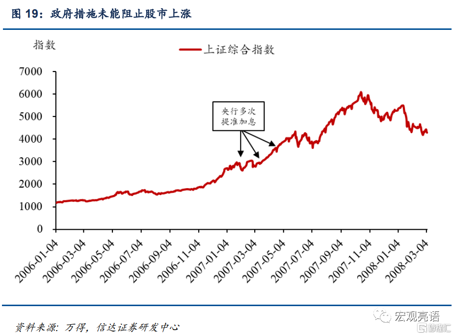 2006-2007年A股一路高涨,2007年10月达高点,2008年金融危机带来熊市。A股从2005年的998点一路上涨到2007年5月29日的4335高点,涨幅高达335%。期间政府的一系列措施,如加息、提准等,都没能挡住股市疯狂上涨的脚步。而财政部于2007年5月29发布消息将股票交易印花税从0.1%提升至0.3%,导致股市暴跌至3404点。但市场将其当成回调消化后,上证综指于2007年8月突破5000点大关。随后一路上涨至10月16日的6124点,牛市才终于结束(图19),之后的熊市来源于2008年国际金融危机。