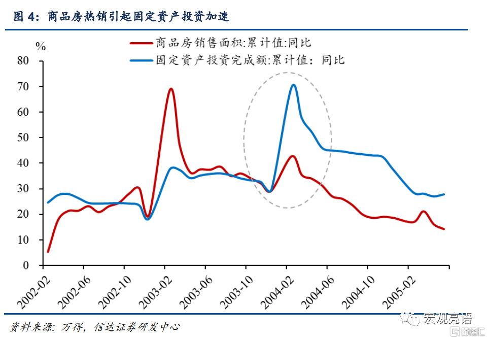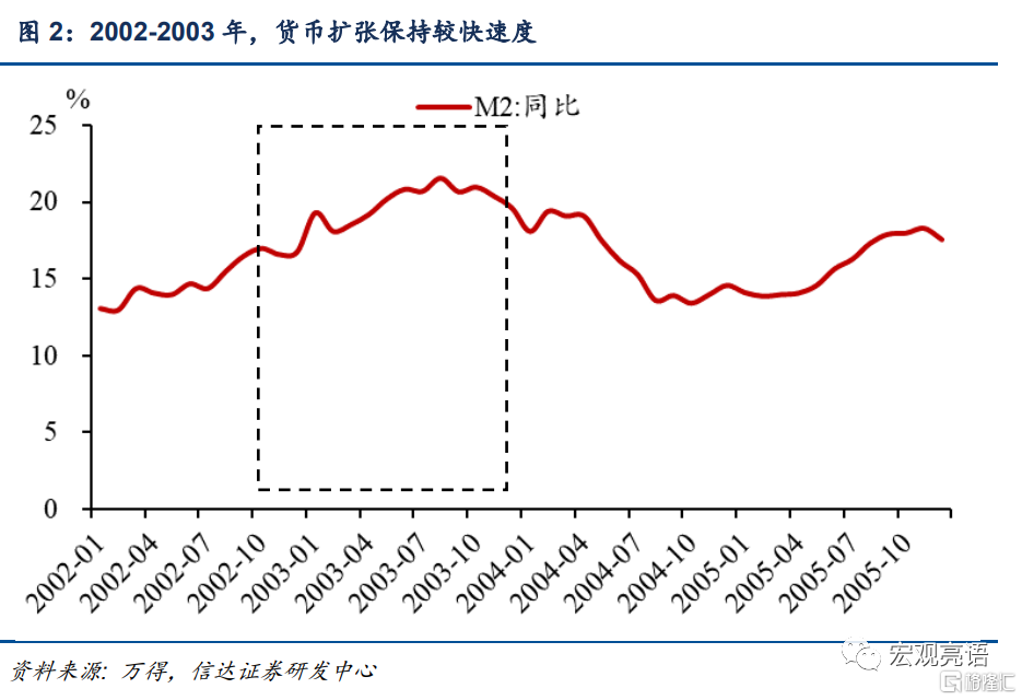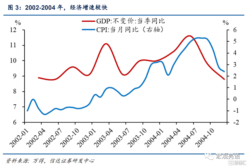 中国加入WTO与房地产市场化持续拉动我国总需求,经济呈现强劲增长状况。2002年11月,十六大宣布中国已“初步建立起社会主义市场经济体制”,中国工业化、城镇化、市场化进程全面提速。2002年12月,中国正式加入世贸组织,对外开放进入全面提速的新阶段。中国走出了自1997年以来有效需求不足、价格水平持续下跌为特征的时期,工业企业利润大幅增加,对贷款的有效需求增强,叠加2003年为应对“非典”疫情,货币扩张并保持较快速度(图2)。其中2002年工业企业盈亏相抵后实现利润总额 5620.4亿元,增长 20.6%,增幅比上年提高 12.5个百分点;2003年 1-6月同比增长高达 56.7%,2003年上半年,固定资产投资同比增长 31%;房地产开发同比增长 34%。在房地产、汽车等消费热点带动下,消费信贷加快速增,2002年全年消费贷款增加34%,推动GDP在2002-2004呈现快速上涨态势(图3)。2003年CPI累计同比增长1.17%,;2004年CPI增长3.9%,与此同时国民经济增长进入上升期。