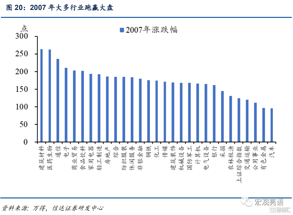 第二轮通胀及应对:2007-2008年。强劲的外需导致我国出现了较大的贸易顺差,外汇占款增加央行被动投放货币,流动性过剩。猪肉价格的上涨和原油价格上涨分别拉动CPI和PPI大幅增加。应对通货膨胀,央行频繁加息提准,首次使用从紧的货币政策表述,针对居民消费价格过快上涨加强农产品生产和供给,同时抑制房地产热。但这些措施并未抑制A股一路高涨,直到2008年金融危机带来熊市,流动性收紧后,消费行业如食品饮料及农林牧渔、和国家“十一五”规划相关的高新技术板块表现优异。