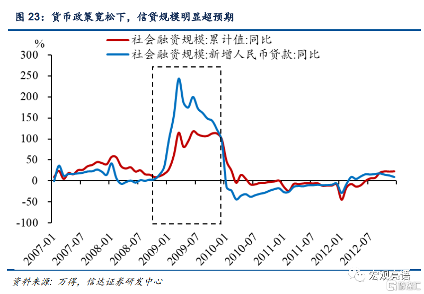 2020-2021年在“四万亿”投资计划影响下,投资和基建取代出口成为经济拉动力。巨量的流动性带来了经济复苏。为了应对次贷危机的负面冲击,2008年11月,政府推出了“四万亿”的投资计划(图22)。货币政策也大幅宽松,存款准备金利率下调2%,降息超过200BP,投资大幅提升,2009年初,PMI触底回升,信贷规模明显超预期(图23)。与此同时,2008年底,政府放松房地产市场的调控,推出一系列支持房地产企业发展的政策,并调低居民住房贷款利率及首付比例,激活居民购房的热情(图24),商品房销售增高。2010年CPI累计同比增长3.3%;2011年CPI增长5.4%。
