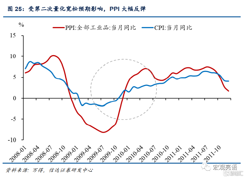 大宗商品持续抬升推动通胀。2010年6月,市场预期美联储开启第二轮量化宽松。受此影响,美元贬值,有色等大宗商品价格持续抬升,直接推高了国内商品的价格。PPI增速2009年12月起快速上行,输入性通胀带来了较大的压力,拉动CPI全年保持上升趋势(图25)。2010年下半年后通胀逐渐脱离居民可接受范围,至2011年4月份达到5.4%的近年来新高。