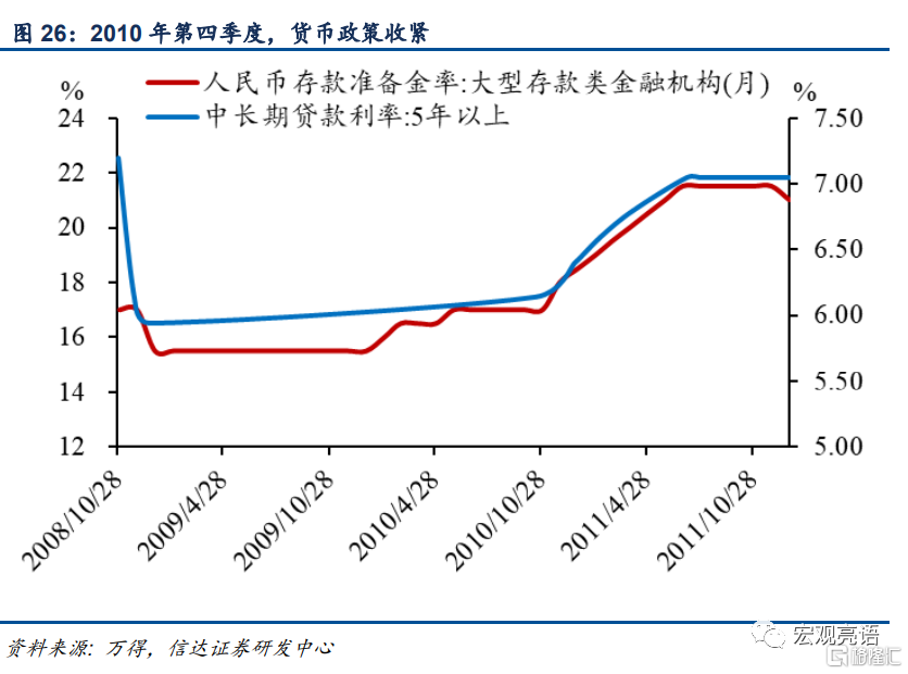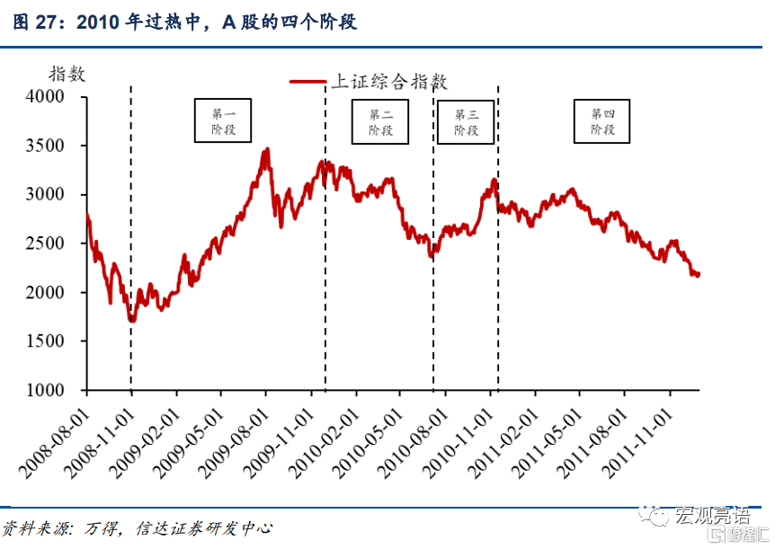 在本轮经济增长过程中,A股资产价格经历了先上涨后回落的过程,可以划分为共4个阶段(图27):(1)2008年11月-2010年1月,受到“四万亿”刺激,以及超预期信贷增速的影响,A股第一次大幅上涨。(2)2010年1月-2010年7月,经济出现快速增长,有一定经济过热的现象,房地产调控加上货币政策转向,A股调整。(3)2010年7月-2010年11月,美国二次量化宽松,大宗商品上涨,A股二次上行。(4)2010年11月后,货币政策紧缩,牛市结束。