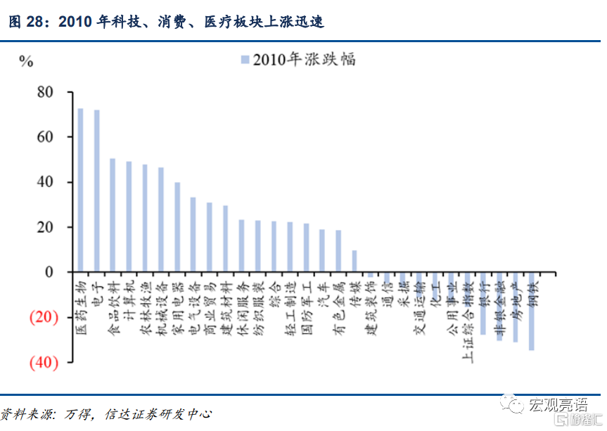 2010年股市出现新的发展机会。2010年11月在紧缩货币政策下,大盘开始下行。中国结构经济开始转型,科技、消费和医疗保健板块占比上升(图28)。背后逻辑是:(1)人口层面,随着人口老龄化问题凸显,医疗、养老等服务需求增强明显。(2)2010年前后开始的以信息技术为代表的新一轮全球技术浪潮开始,移动互联网加速渗透,推动了智能制造的加速发展,新经济行业(医药生物、电子、计算机、传媒)快速发展。因此提高了消费、医疗和科技板块的预期。
