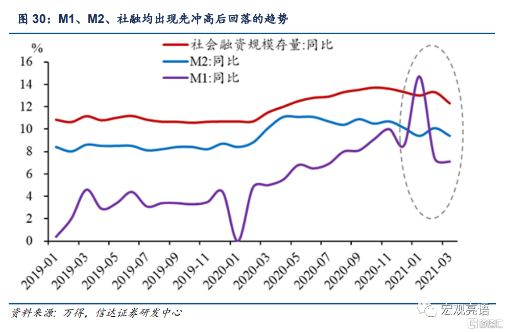 经济端,我国经济持续稳定恢复,发展动力不断增强,全球经济逐步复苏。受新冠疫情影响,2020Q1我国GDP创下了-6.8%的历史低点。进入二季度后,GDP率先恢复增长,由于基数效应2021Q1达到18.3%的高点(图29),两年的平均增长速度在5%左右,居民消费价格(CPI)同比持平。M1、M2、社融指标在2020年底冲高后经历了一个明显的下降过程,反映了疫情临时性宽松措施退出和快速紧信用的影响(图30),相比欧美等发达国家,我国由于疫情防控较为及时,因此经济修复领先。
