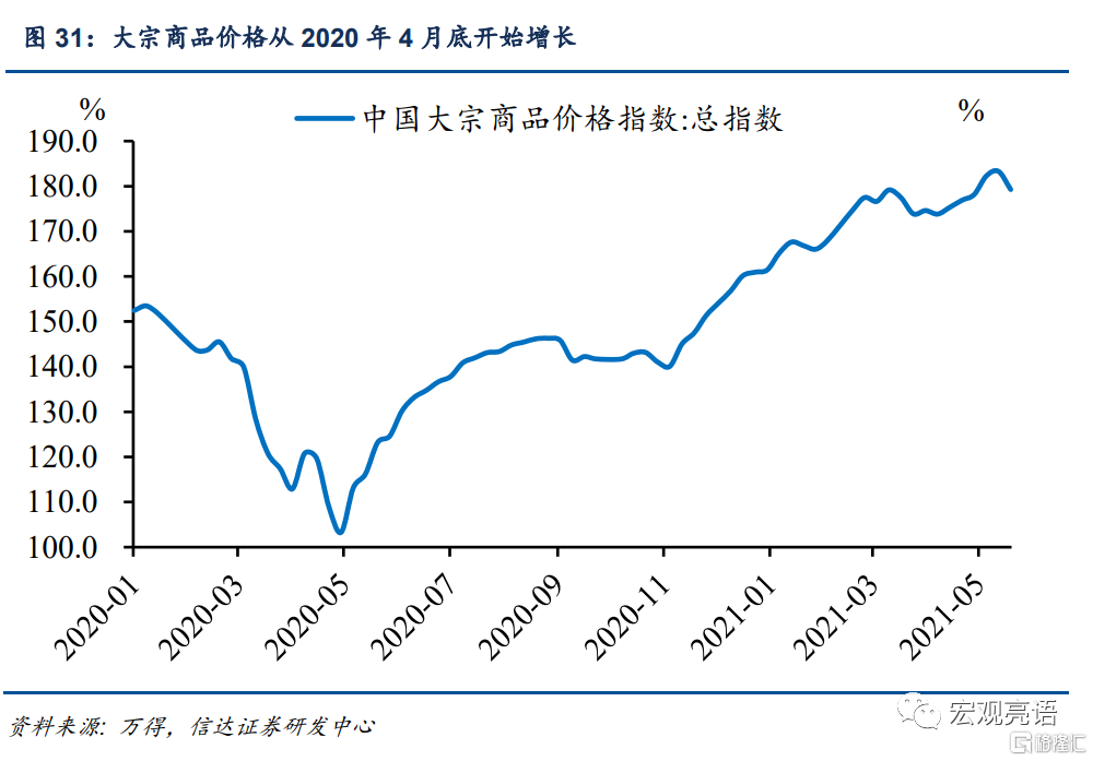 进入2021年以来,全球经济回暖,加上此前货币政策极度宽松的效应逐渐显现,大宗商品和工业品价格上涨明显,全球通胀预期不断发酵。近几个月,全球大宗商品受到全球经济复苏预期价格出现抬升,涨幅接近一倍(图31),我国输入型通胀问题显现。工业企业生产的成本端抬升,采矿业和上游企业行业利润同步抬升,中游企业利润上升幅度相对较小,下游工业企业的利润占比有所下降。国常会部署大宗商品保供稳价工作,减轻下游企业生产压力,随着疫情修复,会对下游企业利润有所改善。