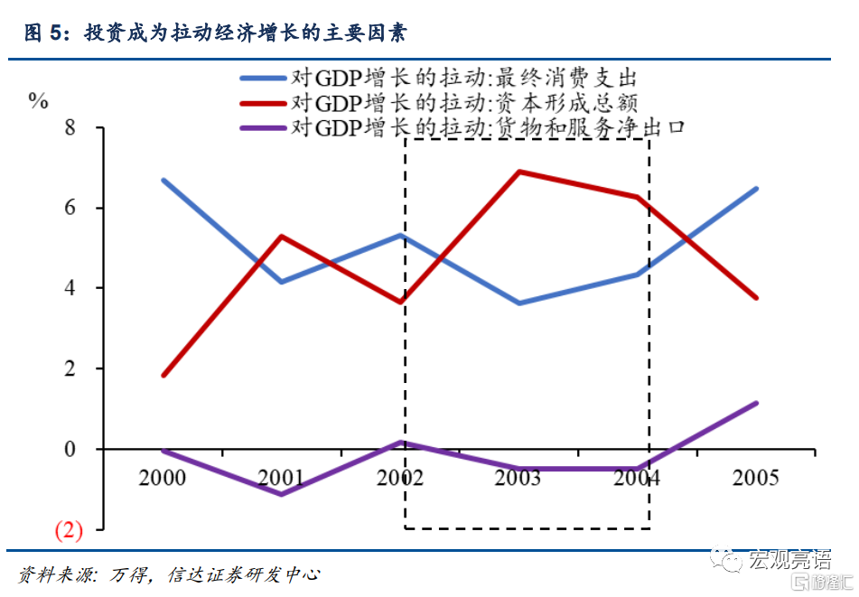 在经济高速发展的同时,一些工业部门出现了超常规的增长,通货膨胀显现。一方面,2003年下半年开始,国内房地产和汽车需求释放、销售强劲;另一方面,地方政府换届导致的政绩工程遍地,钢铁、水泥等产生巨大需求。钢铁和水泥投资成倍增长,引起原材料、运输等价格上涨,刺激了相关行业投资增长,成为通货膨胀的具体表现(图4)。同时,快速增长的银行贷款也促进了投资,部分商业银行面临降低不良贷款率的压力。在三大马车中,投资对经济增长的拉动趋势明显上行(图5)。
