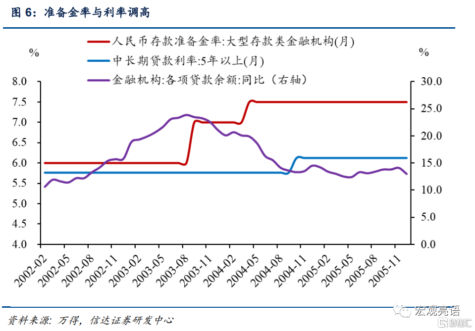 当通货膨胀趋势得到确认后,央行加强货币政策手段的应用,控制信贷的过快增长。第一,发行票据对冲由于外汇储备急剧增加导致的基础货币过热。第二,提高存款准备金率,并实行差别存款准备金制度。2003年9月央行将准备金率由原来的6%调高至7%,2004年4月再次调高至7.5%,以减轻央行票据回收流动性的压力,将资本充足率低于一定水平的金融机构存款准备金率提高0.5个百分点。第三,上调存贷款利率,放开金融机构贷款利率上限。2004年10月,金融机构一年期存款基准利率由1.98%提高到2.25%;一年期贷款基准利率由现行的5.31%提高到5.58%。中长期贷款利率在2004年10月由5.76%提高至6.12%(图6)。第四,上调再贷款和再贴现利率。2004年3月对短期再贷款利率上调0.63个百分点;再贴现利率上调0.27个百分点。