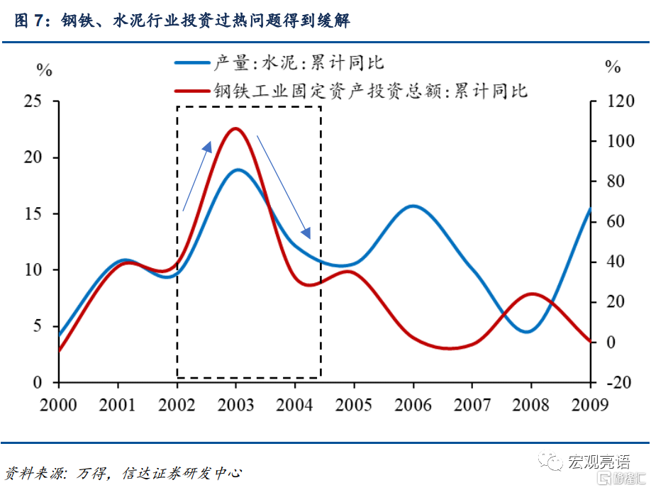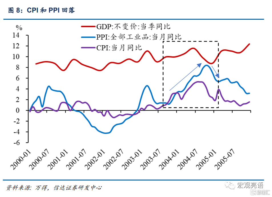 2003-2004年央行调控取得了较好的成效,有效地抑制了固定资产投资增长过快,钢铁、水泥等重点控制行业投资增速大幅回落(图7),在保证经济增长的同时,CPI和PPI也逐步回落至正常区间(图8)。