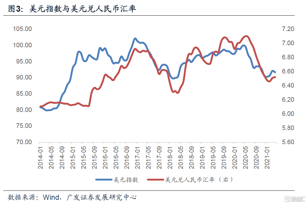 我们常用的人民币汇率标价方式之一是美元兑人民币汇率,它不仅受人民币定价因素影响,同时也会受美元定价因素影响。从数据走势可以看出,2015年之后,美元兑人民币汇率与美元指数相关性变得更强。