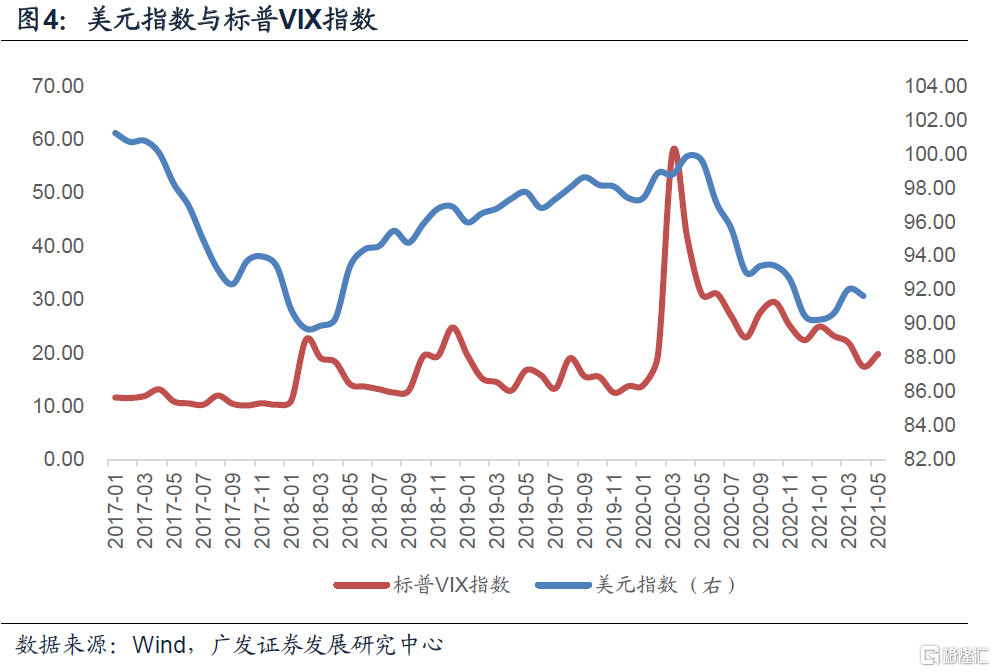 美元为什么走弱?美元的定价因素也是一个多元化框架,但对本轮来说,风险偏好可能是一个关键定价因素。全球疫情整体在逐步好转,疫苗接种在逐步推进,全球经济震荡修复,避险动机有一个逐步下行的过程。从VIX指数在2020年二季度之后与美元指数的同步下行中,我们也能观测到这一点。