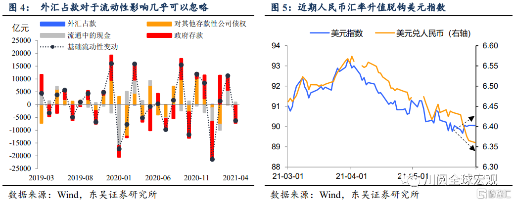 從動態看,外匯存款準備金是國際上用來遏制短期外資流入的一種重要手段,這可能間接導致未來外匯佔款的減少,但當前外匯佔款對國內流動性的影響越來越小(圖4)。