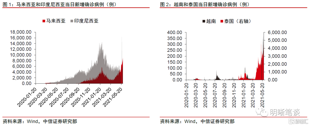 东南亚疫情再起,全球贸易或再受冲击。受印度疫情扩散影响,今年5月以来东南亚地区疫情有所加重。泰国、越南、马来西亚以及印度尼西亚等国疫情再度爆发,2021年5月以来当日新增新冠确诊病例再次激增。以越南为例,疫情集中爆发在北江省和北宁省两个主要工业地区,工人密集度高,部分工厂因此也暂时关闭。考虑到东盟作为国际贸易以及全球制造业产业链中的重要一环,同时此次疫情得到整体控制尚需时间,我们认为全球供应能力或因此再受打击,实现进一步修复的时间点将延后。