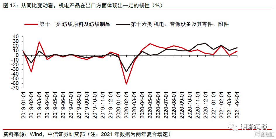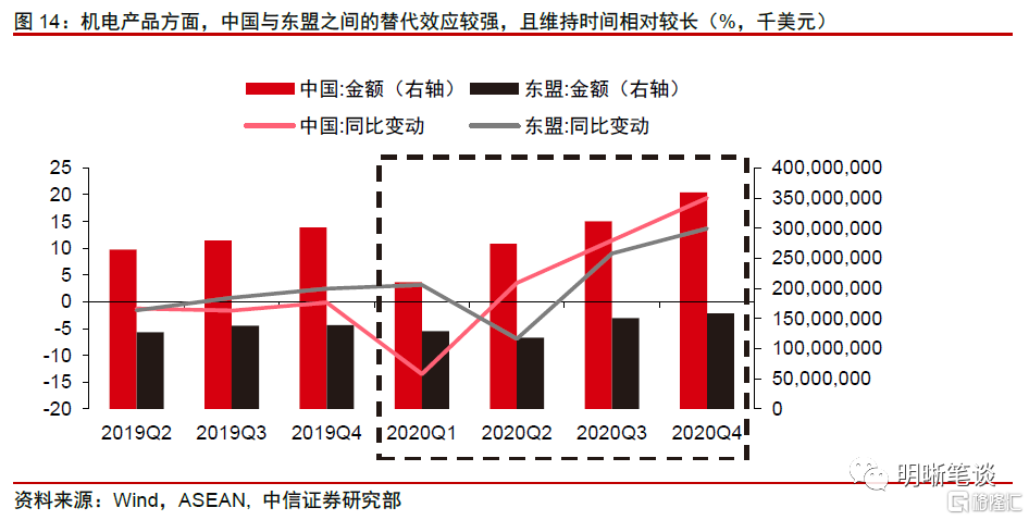 如何看待中国对东南亚出口的替代效应。我国与东南亚国家主要在机电品类和纺织品类领域存在竞争关系。具体来看,劳动密集型产品(以纺织品为代表)的替代效应较容易发生,具体表现为2020年二季度东南亚疫情爆发,在纺织产品出口方面中国对东盟在短期内呈现出较强的替代效应。随着后续东南亚疫情得到控制,强替代效应又促使此类订单快速回流至东南亚地区。因此,我们认为我国对纺织产品出口的替代效应将呈现“来的快,去的快”的特征,具体时间点取决于东南亚疫情恢复情况。另一方面,我国的机电产业正处于转型升级阶段,劳动密集型和资本密集型的机电产业链并存,因此机电产品出口方面既存在一定韧性,又具备与东盟之间的替代效应。