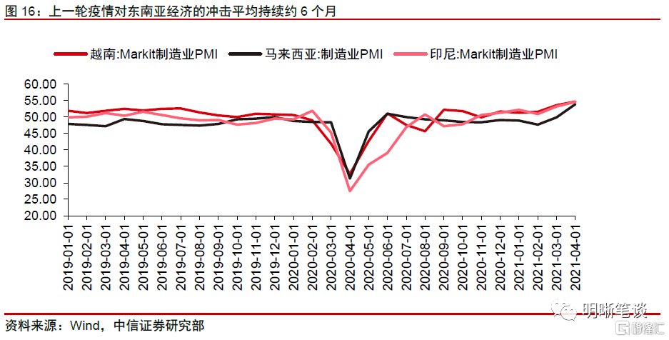 综上所述,从出口贸易的替代效应来看,东南亚疫情爆发或使得我国纺织产品出口呈现短期替代效应,机电产品呈现长期替代效应。结合越南、马来西亚和印度尼西亚的制造业PMI数据,以PMI持续走低为依据,上一轮疫情对其经济的冲击平均持续约6个月。考虑到政府管控经验的积累、疫苗接种进度等因素,我们预计此次疫情对经济基本面造成的冲击或短于上一次,持续时间或为3-4个月左右。在此期间,劳动密集型机电产品和纺织品的替代效应将为我国纺织制品和机电产品两大品类出口提供支撑。