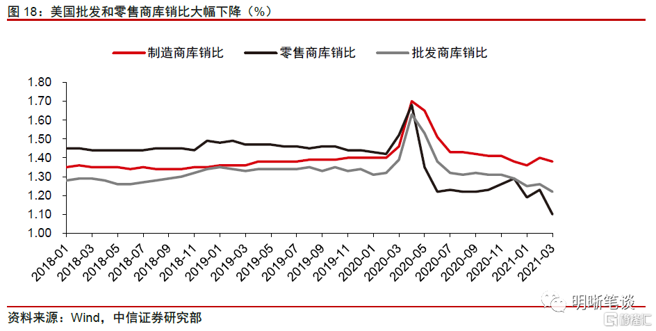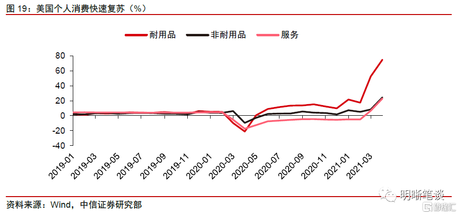 外需是观察我国出口的另一重要视角,作为我国主要的贸易伙伴,欧盟和美国的外需将是拉动我国年内出口的主旋律。欧盟和美国方面,随着疫苗接种率的提升、疫情隔离的逐渐解除,两大经济体或将在二三季度相继迎来第二波修复高峰。以美国为例,从库销比来看,除制造商外,批发商和零售商被动去库,其中零售商的库销比不断创下历史最低水平。从美国个人消费支出来看,耐用品、非耐用品和服务三大类消费支出同比均在2021年4月出现大幅提升,预计美国零售商的低库存和可以预见的补库行为,以及个人消费的复苏将继续支撑我国消费品出口。