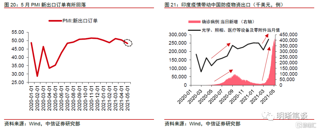 东盟作为我国第三大贸易伙伴,此次疫情或对来自东南亚的外需造成一定冲击,对我国出口形成扰动。根据2021年1-4月我国的出口总额计算,东盟占比达15.02%,是我国重要的贸易伙伴。本轮疫情对东南亚的产能和消费需求均造成一定影响,进而对我国出口产生一定的扰动。据最新披露的5月PMI数据显示,与外贸相关的新出口订单指数录得48.3%,较前值回落了2.1%。我们认为新出口订单指数降至荣枯线以下或在一定程度上反映出东南亚疫情带来的扰动。从产品来看,类比印度在疫情爆发期间我国防疫物资出口高增,预计短期内东南亚对我国防疫物资相关产品出口需求同样会有所增加,而中间品和消费品需求将面临一定的压力。