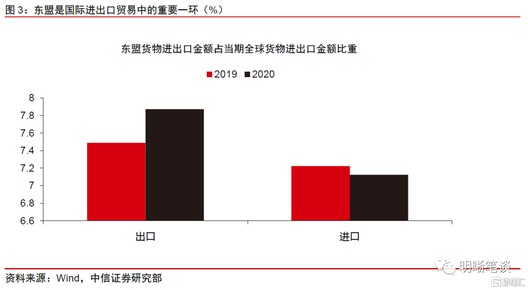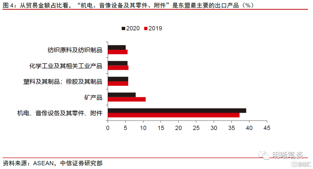 东盟是国际贸易中的重要一环,为全球供应机电、矿产品、塑料、化工原料及制品和纺织原料及制品等。全球视角来看,东盟2019年货物出口金额占同年全球出口金额的7.49%,2020年小幅上升至7.87%;2019年货物进口金额占全球进口金额的7.22%,2020年轻微下降至7.12%。分产品来看,作为全球产业链的重要组成部分,“机电、音像设备及其零件、附件”(HS分类标准)是东盟最主要的出口产品,2019年其出口金额占东盟对全球出口金额比例约为37.26%,2020年所占比重上涨至39.14%;前五大主要出口产品2019年合计占比约65.18%,2020年合计占比约63.42%。