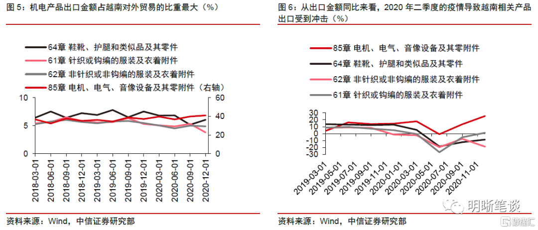 机电产品和轻工制品出口占越南出口比重较大,二次疫情或对2021年二季度和三季度越南相关产品出口影响较大。在HS分类标准下,越南的主要出口商品包括“电机、电气、音像设备及其零附件”、“鞋靴、护腿和类似品及其零件”、“非针织或非钩编的服装及衣着附件”以及“针织或钩编的服装及衣着附件”。2019年上述4类产品的每季度出口金额占总出口金额的平均比例分别约为36.63%、7.18%、5.71%和5.62%。2020年二季度为越南上一轮疫情爆发的主要时间,期间越南的机电类产品出口金额同比下跌0.87%,逆转了自2019年一季度以来的持续高增局面;鞋靴和服装类产品的出口金额同样出现大幅下跌。此次疫情在越南工人密度高的北江省、北宁省工业区传播,两省作为越南重要的工业产地,当地多家企业工厂目前已经暂时停产,或导致供应链和生产链受阻严重,受此影响越南的机电产品和轻工制品出口或有所下降
