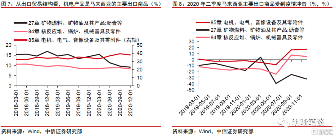 马来西亚以出口机电产品和矿物燃料为主,类比2020年Q2疫情对其主要出口品的影响,本轮疫情或对机电产品出口产生影响较大。在HS分类标准下,马来西亚的主要出口商品包括“电机、电气、音像设备及其零附件”、“ 矿物燃料、矿物油及其产品、沥青”和“核反应堆、锅炉、机械器具及零件”。在2019年上述3类产品的每季度出口金额占总出口金额的平均比例分别约为34.42%、14.48%和9.16%。2020年二季度疫情爆发后,马来西亚的机电产品出口金额同比下跌11.75%。在疫情有所控制的情况下,矿物燃料出口仍然持续处于负同比增长状态,机电产品出口则逐步恢复。类比来看,此次疫情或打乱机电产品出口复苏节奏,导致其短期内出现同比回落