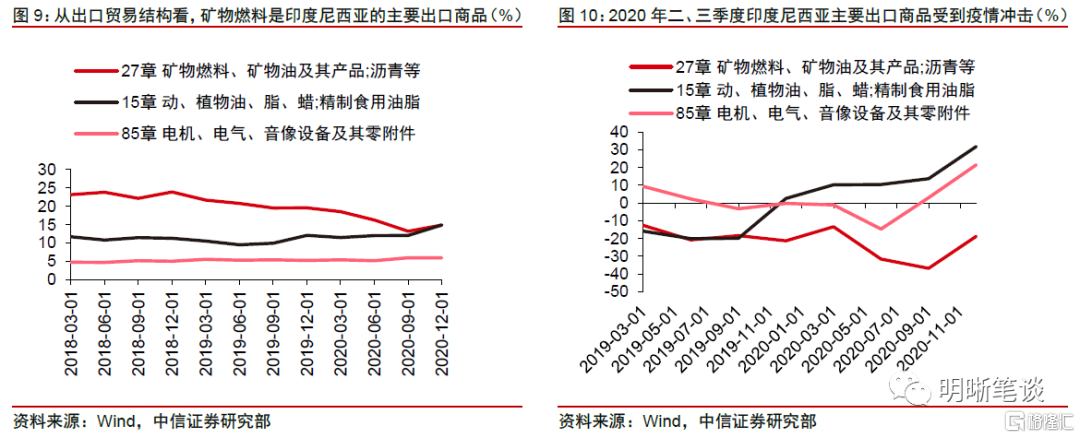印度尼西亚主要向全球出口矿物燃料和动植物油脂,疫情对其主要出口品的影响分化明显。在HS分类标准下,印度尼西亚的主要出口商品包括“矿物燃料、矿物油及其产品、沥青”、“动、植物油、脂、蜡;精制食用油脂”和“电机、电气、音像设备及其零附件”。在2019年上述3类产品的每季度出口金额占总出口金额的平均比例分别约为20.36%、10.50%和5.38%。2020年第一轮疫情在印度尼西亚爆发期间,其“电机、电气、音像设备及其零附件”出口金额同比在第二季度下跌14.71%;而矿物燃料的出口金额同比下降趋势则从二季度延续至三季度;相较之下,“动、植物油、脂、蜡;精制食用油脂”出口未受到疫情扰动,逆势保持同比增长。考虑到印度尼西亚的贸易结构和产品出口金额同比变动,此次疫情爆发或对印度尼西亚2021年二季度和三季度的矿物燃料产品出口影响较大,对动植物油脂和机电产品影响有限