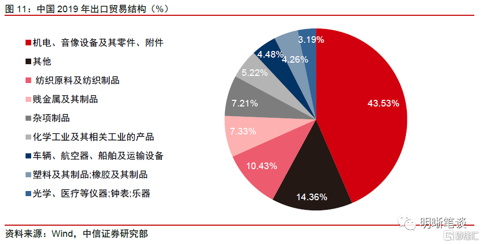 对比中国和东盟部分成员国的出口结构,再结合2020年各国出口情况判断,我国与东南亚国家主要在机电品类和纺织品类领域存在出口竞争关系。以疫情前(2019年)我国的出口贸易结构为参考,机电类产品占比高达43.53%(“电机、电气、音像设备及其零附件”+“核反应堆、锅炉、机械器具及零件”),其次为纺织、贱金属及其制品、化工产品、塑料产品等。对比东盟整体以及部分成员国的出口贸易结构,我国与东南亚国家在纺织品类和机电品类领域存在一定的竞争与替代关系,其中纺织产品是典型的劳动密集型产品,而我国的机电产品正处于从劳动密集型产品向资本密集型,甚至技术密集型转变的过程中。因此我们认为此次东南亚疫情的爆发背景下,我国出口的替代效应在上述两个品类中仍然有所延续。