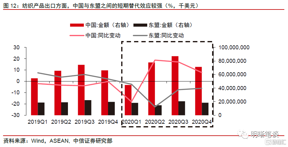 强替代效应下,我国纺织品等劳动密集型产品出口对东南亚的替代效应持续时间或较短。由于劳动密集型产品的替代效应较容易发生,当前东南亚疫情再起,叠加印度疫情仍然严峻,或造成部分纺织业订单回流中国,目前回流的纺织订单多为“短、小、散”。此外,随着后续东南亚疫情得到控制,强替代效应又会促使此类订单快速回流至东南亚地区。观察2020年Q3和Q4两个经济体的纺织品出口表现,东盟的纺织品出口该时间段内有所恢复,受此影响中国Q4的纺织品出口出现同比下滑。因此,我们认为我国对纺织产品出口的替代效应将呈现“来的快,去的快”的特征,即强替代效应会引导部分订单在两个经济体中流动,由此产生的出口增量持续时间较短,具体将取决于东南亚疫情恢复的时间。