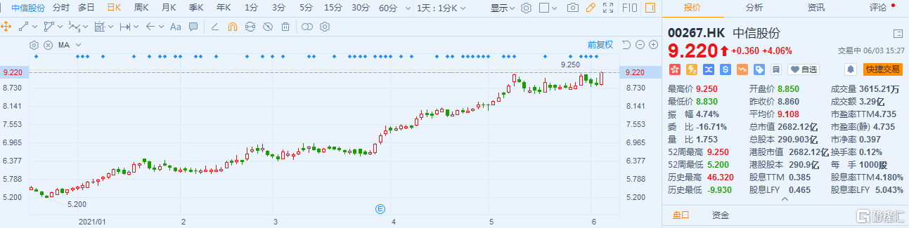 格隆汇6月3日丨中信股份(0267.HK)股价继续走强,现报9.22港元,涨幅4.06%,最新总市值2682.12亿港元;该股前面已连续上涨五个月,累计涨幅逾60%。富时罗素公布第二季季度检讨结果,中信股份等股份获纳入富时中国50指数,变动将于6月21日生效。
