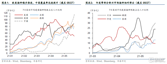 随着疫情边际好转,美国、欧元区服务业分别从3月份、5月初开始重启。美国、英国、德国、法国封锁措施陆续解除。发达国家当中,日本的疫苗接种相对滞后(目前覆盖率为4.1%)、目前仍受3月初开始的新一轮疫情冲击,距离东京奥运会开幕仅有两个月,其疫情防控压力较大。欧美发达国家和部分新兴市场国家疫苗接种“冷热不均”,是疫情影响难以在全球范围内彻底消除的主要因素。印度、部分东盟国家疫情局势仍较为严峻(图表4)。印度疫情3月下旬以来大幅反弹,5月初以来,变异毒株有向周边东南亚国家蔓延趋势。或出于选情考虑,印度总理莫迪今年过早宣布放松疫情防控措施,印度群众大规模参加各类节日及选举集会,加剧了印度疫情增长风险。截至5月下旬,印度日新增疫情病例数仍在30-40万例之间;印度人口基数较大,当前的疫苗产能/供给暂时难以满足其接种需求。马来西亚、菲律宾、泰国等东盟国家疫情升级可能影响其制造业生产和出口。