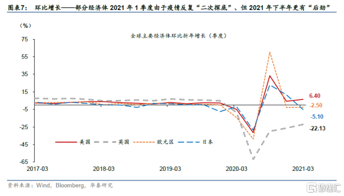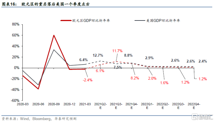 从增长动能转换分析,欧元区、日本、新兴市场增长或将接棒美/英。中国本轮内需复苏领先美/英,而美/英领先欧元区及南亚/东欧的新兴市场国家。主要经济体中,由于欧元区、日本疫情反复,重启和疫苗接种速度落后美国1个季度左右,欧元区和日本等国环比增长2021年3季度可能明显强于2季度,推升全球环比增速(图表16)。具体看,美国2021Q2环比折年增长率可能达到接近13%、而Q3回落到7.5%左右;而欧元区、日本2021Q2增长环比折年率可能分别为4%和零增长,2021Q3分别回升到12%和9%左右(图表17)。