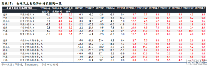 我们预计全球实际GDP增长2021年达到6.8%,而2022年仍保持在5%的较快同比扩张速度——我们对两年增速的预测值均高于彭博一致预期(2021年6%、2022年4.4%)。由于去年2季度基数较低,我们预计全球同比增长高点出现在2021年2季度,达到12.7%,而2021Q4回落至6%左右。鉴于2020-2021年全球大额的财政刺激及积累的超额储备仍有待释放(具体见第18页财政政策讨论及第33页投资和消费结构展望)、总体金融条件仍偏宽松(具体见第26页货币政策讨论),且全球重启进程“参差不齐”,我们预计2022年全球增长仍有后劲。预计全球2022年保持在5%的高于“趋势水平”的增长率,其中欧元区、日本、以及中国以外的新兴市场国家可能“后劲”更足。