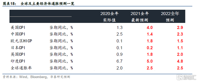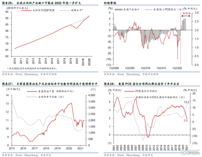 1. 全球产出缺口可能在2021年3季度弥合,且之后一路走高。据我们的预测,全球总产出可能在2021年3季度回到无疫情情况下的趋势水平,此后累积产出缺口会一路走高,其中以美国产出缺口表现最为明显(参见3月23日发布的《再次上调美国增长、双赤字及通胀预测》(图表25)。具体看,按照我们预测中的增长路径,如果假设无疫情情况下全球实际GDP按照2019年的增速持续增长,2021年3季度全球实际GDP将回到趋势水平,2021年全年平均产出缺口为-1.4%,但2022年全年产出缺口将转为+1.2%。产出缺口转正、上升、往往对应着通胀高出趋势水平(图表26)。