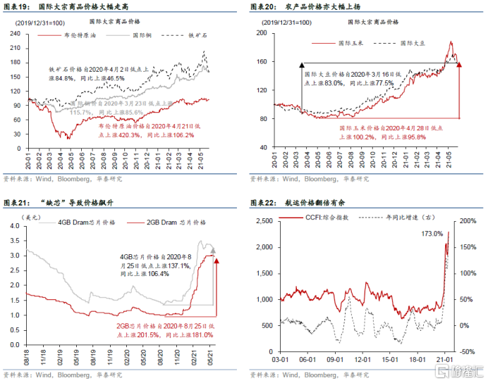目前,部分商品通胀压力凸显已经是不争的事实。如我们在3月23日发布的《再次上调美国增长、双赤字及通胀预测》所分析的,虽然全球经济重启仍在早期阶段,大宗商品需求尚有较大回升空间,但各项商品供需已然趋紧,其中供给较紧的商品通胀压力最为明显。具体看,布伦特原油(现价)、国际铜价、铁矿石价格等大宗原材料价格分别较2020年3-4月的低点上涨420.3%、115.7%、84.8%,最近一年的同比涨幅分别达106.2%、85.6%、46.5%(图表19);国际玉米、大豆等农产品价格分别较2020年3-4月的低点上涨100.2%、83.0%,同比涨幅分别为95.8%、77.5%(图表20)。再举一例,如我们在5月20日发布的《“缺芯”对增长和通胀影响几何?》中所述,疫情导致供应链受损,全球范围内的“缺芯”现象也愈演愈烈,芯片价格自2020年8月底已上涨了1.4-2倍,过去一年也上涨了一倍有余(图表21)。同时,出口需求激增、供给受阻导致集装箱“一箱难求”,运价指数过去一年的涨幅高达173%(图表22)。此类“涨价”现象不胜枚举。