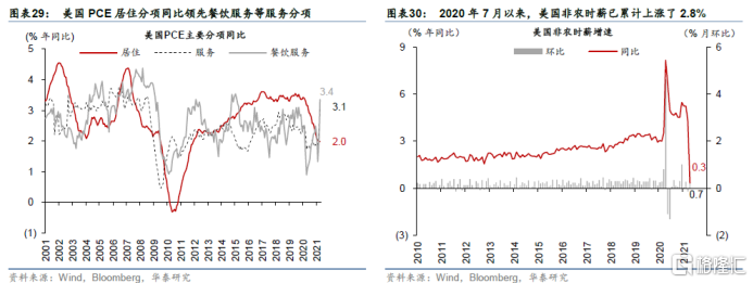 3. 全球地产价格通胀周期可能再延续3个季度、或更长,而租金反应滞后地产价格——地产价格持续通胀将继续推升租金及其他服务业成本。去年疫情爆发后,利率下行、大规模财政转移支付以及股市财富效应大幅推升全球居民的住房购买力,叠加疫情催生的“疏离居住”需求,共同带动全球房屋销售强劲增长。短期内,主要经济体的低利率、就业改善、居民超额储蓄释放以及居民部门杠杆率较低等因素,仍将为全球地产需求提供支撑。另一方面,疫情影响下房屋供给恢复缓慢,当前房屋库存偏低。因此本轮全球地产价格上涨周期可能较有粘性,“供不应求”的局面短期内可能延续(见专栏1)。由于美国PCE居住分项同比通常滞后房价1年半左右(图表28),考虑到美国房价同比增速从2019年4季度开始回升,同时联邦政府颁布的暂停驱逐租客令将于今年6月底到期,我们预计租金价格同比增速可能很快进入上行通道。由于与其他服务业通胀关联度较高,租金价格上升不仅直接推升核心通胀,同时将推高其他服务业成本,从而带动核心通胀同比快速上行(图表29)。