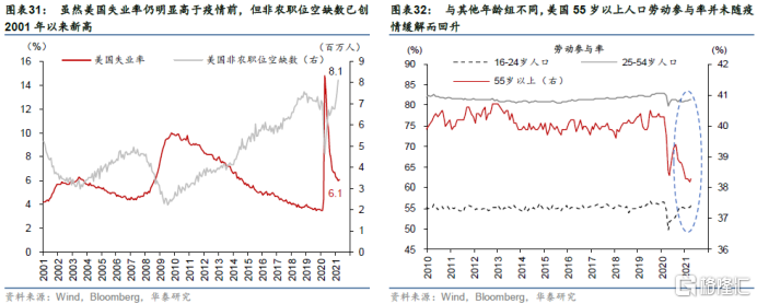 4. 劳工薪酬上涨加速,推升服务业通胀及增加通胀“粘性”。虽然结构性因素导致失业率尚未回落至疫情前的水平,但主要经济体劳动力市场已呈现供需趋紧态势。由于受疫情冲击较大的行业薪酬水平相对较低,2020年4月美国非农时薪环比大幅跳升4.6%。随着疫情缓解,理论上非农时薪的涨幅会相对偏低。然而,2020年7月以来,美国非农时薪已累计上涨了2.8%,上涨幅度已超出衰退后的一般“节奏”(图表30)。在失业率仍比2019年底高2.5个百分点的同时,2021年3月美国非农职位空缺数达812万人,创2001年以来新高(图表31)。另一方面,一些人群可能半永久退出劳动力市场,如美国55岁以上人口劳动参与率并未随疫情缓解而回升(图表32)。综合来看,我们预计全球工资上涨趋势可能有一定的持续性。