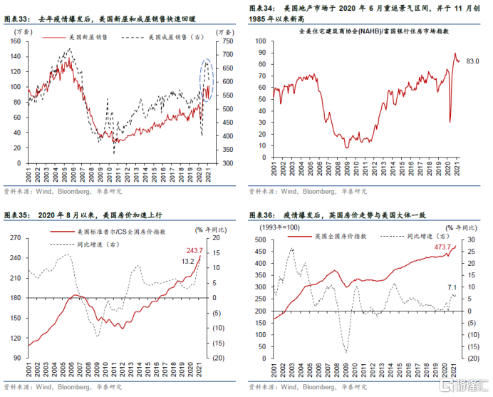 去年疫情爆发后,全球地产需求强劲反弹,并远超疫情前水平。在经历2020年3-4月的短暂下跌后,美国地产需求一枝独秀。美国新屋销售率先于2020年5月大幅回升,并持续保持15%以上的快速增长,2020年全年增长20.5%,远高于2019年的11.5%;美国成屋销售同比增速也于2020年7月转正,2020年全年增长6.1%,明显高于2019年的-0.2%(图表33)。同时,反映美国房地产市场景气程度的全美住宅建筑商协会(NAHB)/富国银行住房市场指数于2020年6月重返景气区间(即高于50),并于11月达到1985年以来最高水平90(图表34)。2020年8月以来,美国标准普尔/CS全国房价指数加速上行(图表35)。实际上,去年疫情爆发后,全球地产周期同步上行,如英国房价指数同比也从2020年8月开始加速上升(图表36)。然而,2020年11月以来,美国成屋销售套数持续下行,全美住宅建筑商协会(NAHB)/富国银行住房市场指数也触顶回落,但仍明显高于疫情前水平。