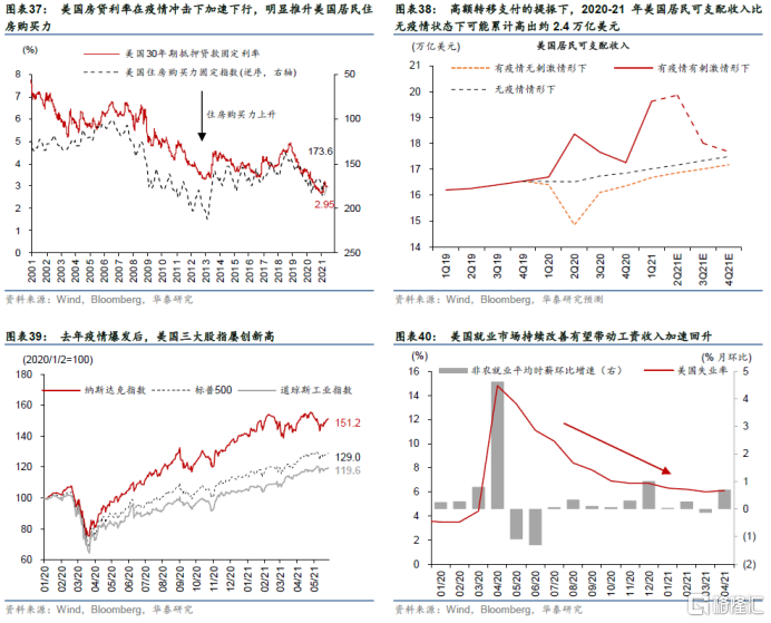 利率下行、大规模转移支付以及股市财富效应大幅推升全球居民的住房购买力,叠加疫情催生的“疏离居住”需求,共同带动全球房屋销售强劲增长。随着美联储加息周期结束,美国30年期固定房贷利率自2018年底开启下行周期,疫情冲击下进一步加速下行至2021年初2.65%的历史低位,明显推升美国居民住房购买力指数(图表37)。如我们在3月23日发布的《再次上调美国增长、双赤字及通胀预测》所分析的,美国先后推出五轮共达5.7万亿美元的大规模财政刺激,其中近5成、约2.7万亿美元为对中低收入人群的转移支付。据我们测算,在高额转移支付的提振下,2020-21年美国居民可支配收入比无疫情状态下可能累计高出约2.4万亿美元(占2020年GDP的11.2%;图表38)。此外,部分受益于抗疫宽松政策释放的充足流动性,美国三大股指屡创新高,当前点位均明显高于2020年初的水平,在一定程度上提振美国中高收入人群的财富规模(图表39)。