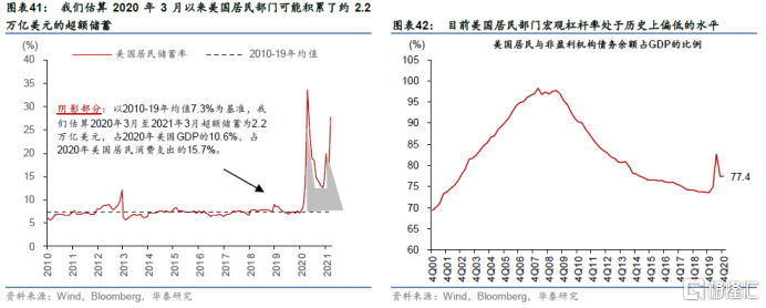 短期内,主要经济体的低利率、就业改善、居民超额储蓄释放以及居民部门杠杆率较低等因素,仍将为全球地产需求提供支撑。年初至今,伴随美国增长和通胀预期走强,美国30年期固定房贷利率小幅回升至2.95%,但仍明显低于疫情前2019年底3.7%左右的水平,由此美国住房购买力固定指数仍小幅高于2019年底的水平。同时,虽然财政转移支付规模自2021年6月起或将大幅下降,但就业市场持续改善有望带动工资收入回升(图表40)。更重要的是,以2010-19年的平均储蓄率为基准,我们估算2020年3月以来美国居民部门可能积累了约2.2万亿美元的超额储蓄,占2020年GDP的10.6%(图表41)。考虑到美国大概率于今年夏季实现群体免疫,超额储蓄有望逐步释放、提振居民消费需求。此外,2020年下半年以来,美国居民与非盈利机构宏观杠杆率(即债务余额占GDP的比例)明显回落至77.4%,仍处于历史上偏低的水平,存在进一步加杠杆的空间(图表42)。综合来看,虽然美国购房需求可能会逐渐回落至疫情前正常水平,但我们预计短期内可能仍颇具韧性。