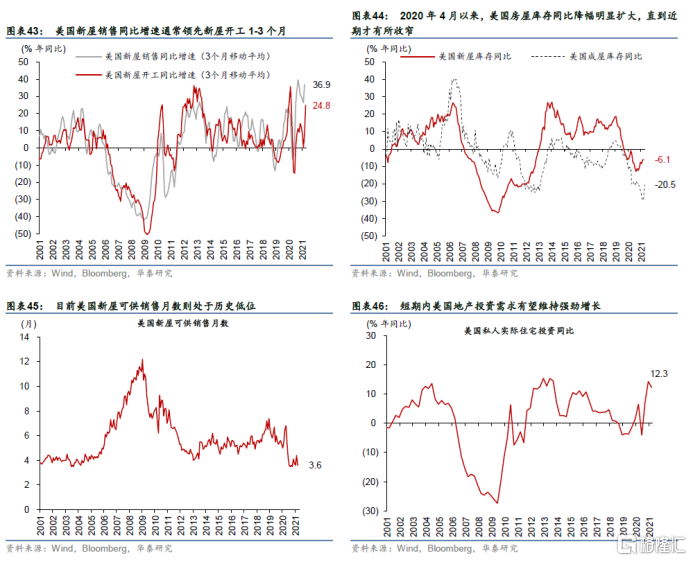需求强劲而供给恢复缓慢、库存偏低,意味着全球地产价格通胀可能较有“粘性”。从历次地产周期来看,美国新屋销售同比增速一般领先新屋开工1-3个月,且两者增速水平大体相当(图表43)。受抗疫隔离措施影响,此次美国新屋开工同比增速的回升幅度明显不及新屋销售,2020年底新屋开工数才回升至疫情前2020年2月的水平。需求强劲而供给恢复偏慢,导致美国地产库存快速去化。2020年4月以来,美国新屋库存同比降幅快速走扩,直到2020年底才开始收窄,而美国成屋库存同比降幅则持续加速下行至2021年3月(图表44),而美国新屋可供销售月数则从2019年底的5.3个月明显下降至2021年3月的3.6个月、处于历史低位,反映美国地产市场具有较强的补库需求(图表45),我们预计短期内美国地产投资需求有望维持强劲增长(图表46)。在库存回归正常水平之前,全球地产价格可能仍面临一定的上行压力。