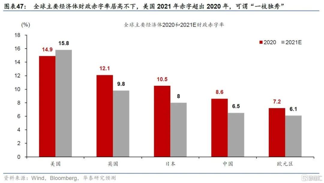 全球财政协同性增强、下一阶段主要经济体财政政策的总体方向或是——加强基建投资、改善收入分配。首先,美国财政正处于很多年来最宽松水平,而未来财政主要方向有望从对居民直接支付,转向基建、加税等更“长期”的计划——如我们在《美国增长或将呈“过热”之势》(20210224)及《再次上调美国增长、双赤字及通胀预测》(20210323)中所述,2020财年美国联邦财政赤字率高达14.9%,为二战以来的最高水平,扣除周期性财政赤字,我们估算2020财年美国去除周期性因素的净财政刺激(fiscal impulse)占名义GDP的13.5%。而美国最近一轮1.84万亿财政刺激中包含约9,000亿的对居民的直接转移支付、大部分在今年前三季度支付完毕,虽然今年美国经济增长有望“V型”回升,财政收入恢复、周期性财政赤字明显收窄,但在大额刺激计划助推下,2021财年赤字率可能继续维持在高水平。