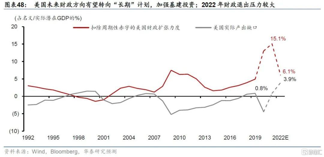 全球财政政策在2021年保持相对宽松。虽然增长有望大幅回升(参见第7页图表7)、即“被动”财政赤字的体量会逆周期大幅收窄,但全球主要经济体——美、欧、英、日等的财政赤字率可能在2021年继续保持在较高的水平(图表47)。其中美国财政扩张力度最大、尤其是考虑到2021年在经济V型反弹状态下,拜登政府先后两轮9000亿和1.84万亿美元抗疫财政刺激将产生大量的“净”财政扩张(图表48)。大规模财政扩张有望迅速弥合产出缺口、并进一步推升产出缺口到“正”区间,推升企业现金流、使得居民超额储蓄在(去年已经很高的基础上)进一步大幅上行,为下一阶段的消费和资本开支周期提供基础。