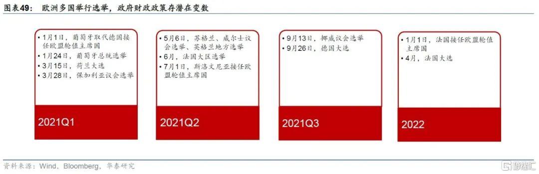 2022年美国财政退出宽松的压力大于欧洲。美国2021财年的财政赤字率可能保持在16%左右的水平、赤字额上升14%;而欧元区财政赤字率在2021年或相比2020年回落1.1个百分点(2020年为7.2%、ECB预计2021年为6.1%)、赤字额缩小10%左右。然而,2022年美国财政赤字率或将下降10个百分点左右,而欧洲削减财政赤字的压力小于美国——一方面基数较低、另一方面,考虑到欧洲的政治周期(德国将于9月举行大选;法国6月进行地区议会选举、明年4月大选)、以及后疫情时代的“民心所向”,欧元区主要国家财政支出或继续保持扩张。即便德国绿党在9月大选中未能实现“颠覆”,但其支持率上升、“威胁”到执政党地位,执政党为稳固地位,出台增加基建/环保投资、增加直接支付、缩小贫富差距等财税政策的动力可能更大。