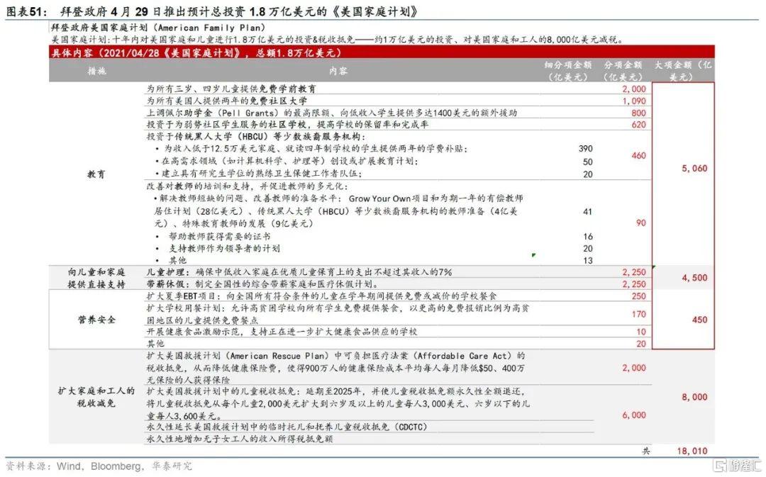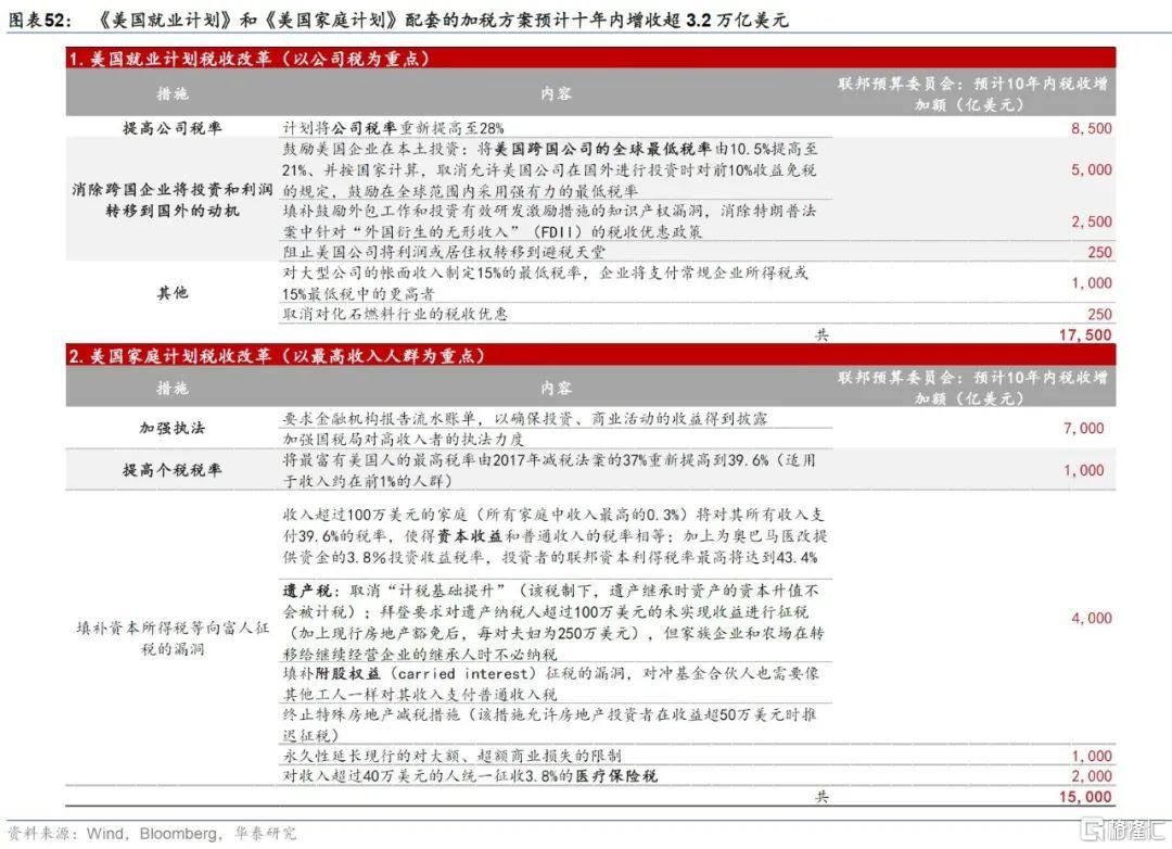 《美国就业计划》总额2.34万亿美元,重点在于改善美国基础设施、完善清洁能源建设,创造更多就业等;《美国家庭计划》总额约1.8万亿美元,重点涵盖教育、育儿、带薪休假等方面。为满足“伯德规则”,白宫在《就业计划》和《家庭计划》中也分别提出了以公司税和个人收入税为重点的税改方案,联邦预算委员会预计相关改革分别将在10年内增税1.75万亿和1.5万亿美元;最主要的税改措施包括:1)将公司税率(不分档)重新提高至28%、联邦预算委员会预计十年增收8500亿美元;2)将美国跨国公司的全球最低税率提高至21%、以鼓励美国企业回归本土投资,估计未来十年增收5000亿美元;3)将最高一档个人税率提高至特朗普减税前的39.6%,预计未来十年增收1000亿美元;3)对收入超过100万美元的(家庭)纳税人征收最高达39.6%的资本利得税,预计未来十年增收4000亿美元。